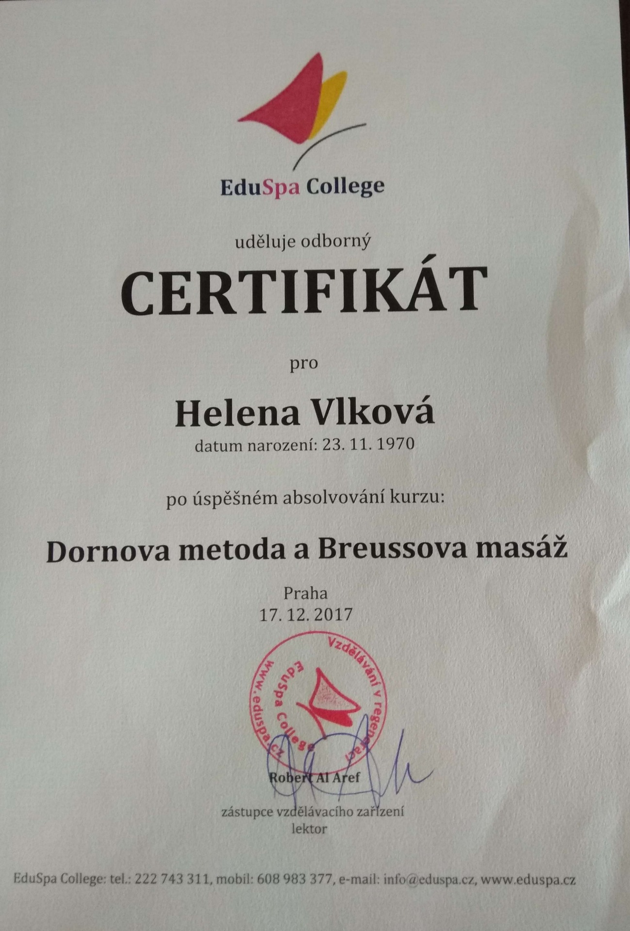 CERTIFIKÁT - DORNOVA METODA A BREUSSOVA MASÁŽ
