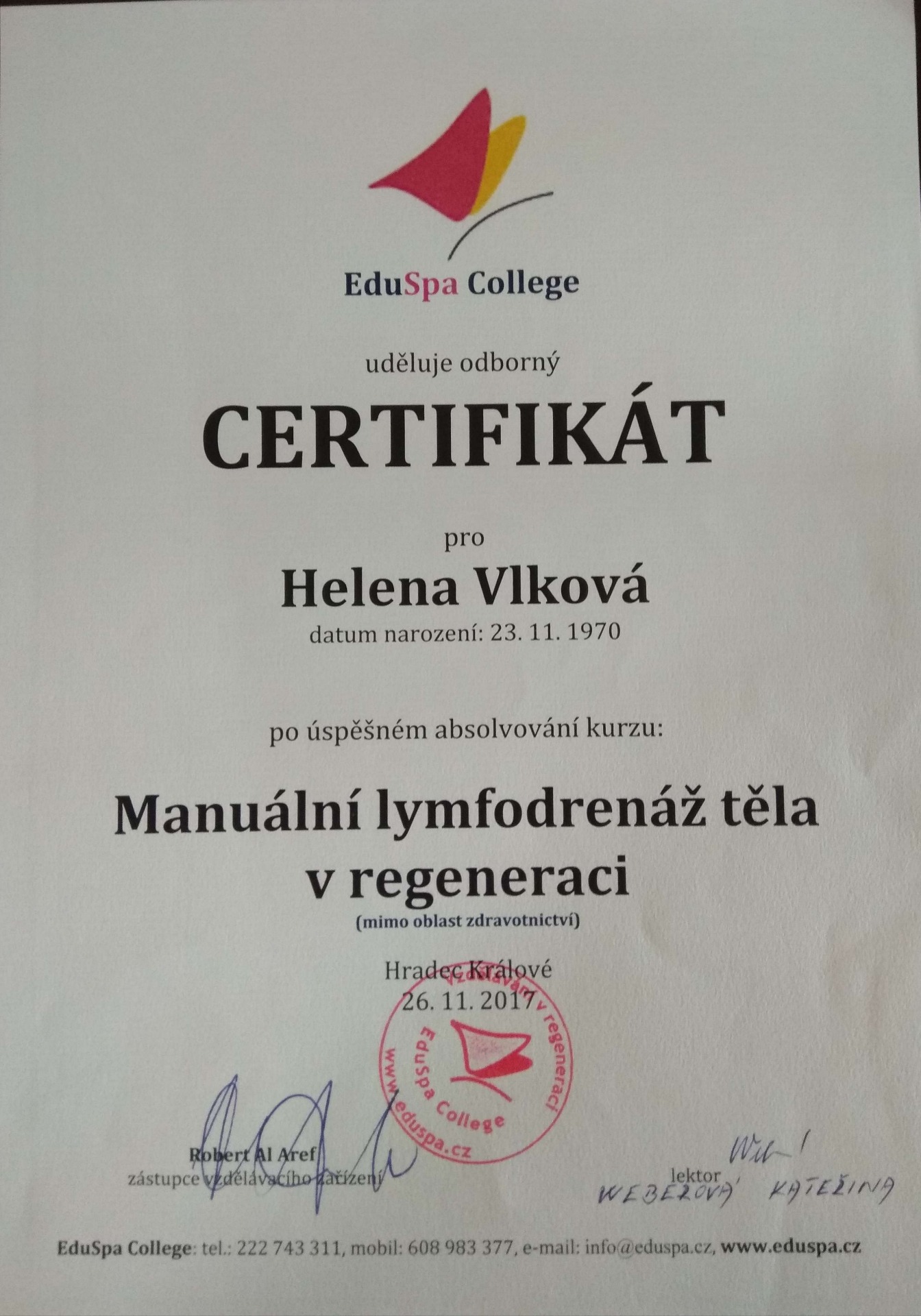 CERTIFIKÁT - MANUÁLNÍ LYMFODRENÁŽ TĚLA V REGENERACI