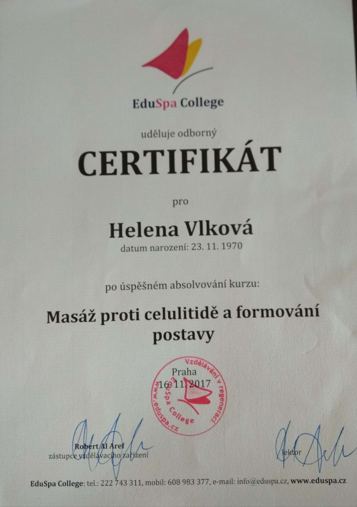 CERTIFIKÁT - MASÁŽ PROTI CELULITIDĚ A FORMOVÁNÍ POSTAVY