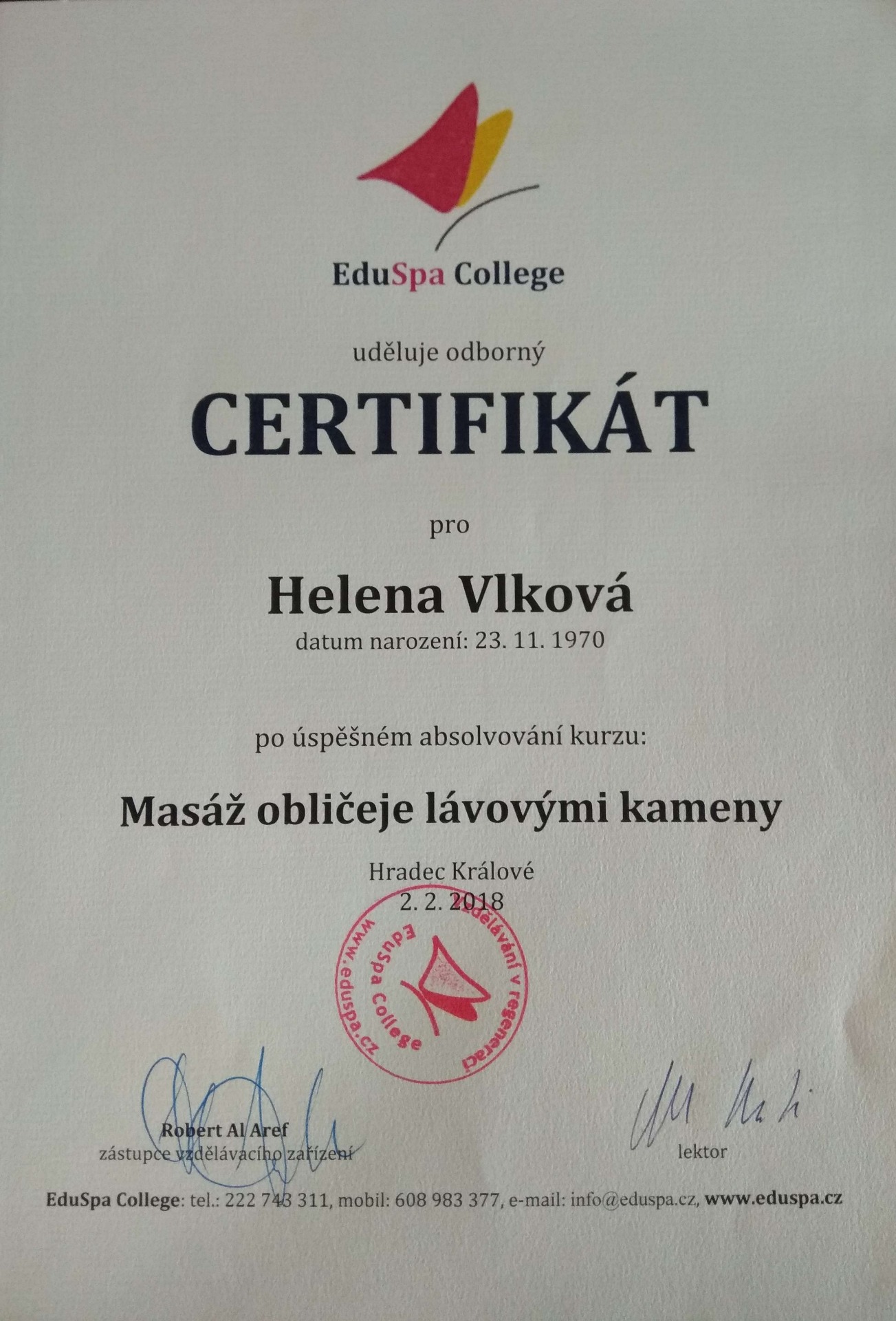 CERTIFIKÁT - MASÁŽ OBLIČEJE LÁVOVÝMI KAMENY